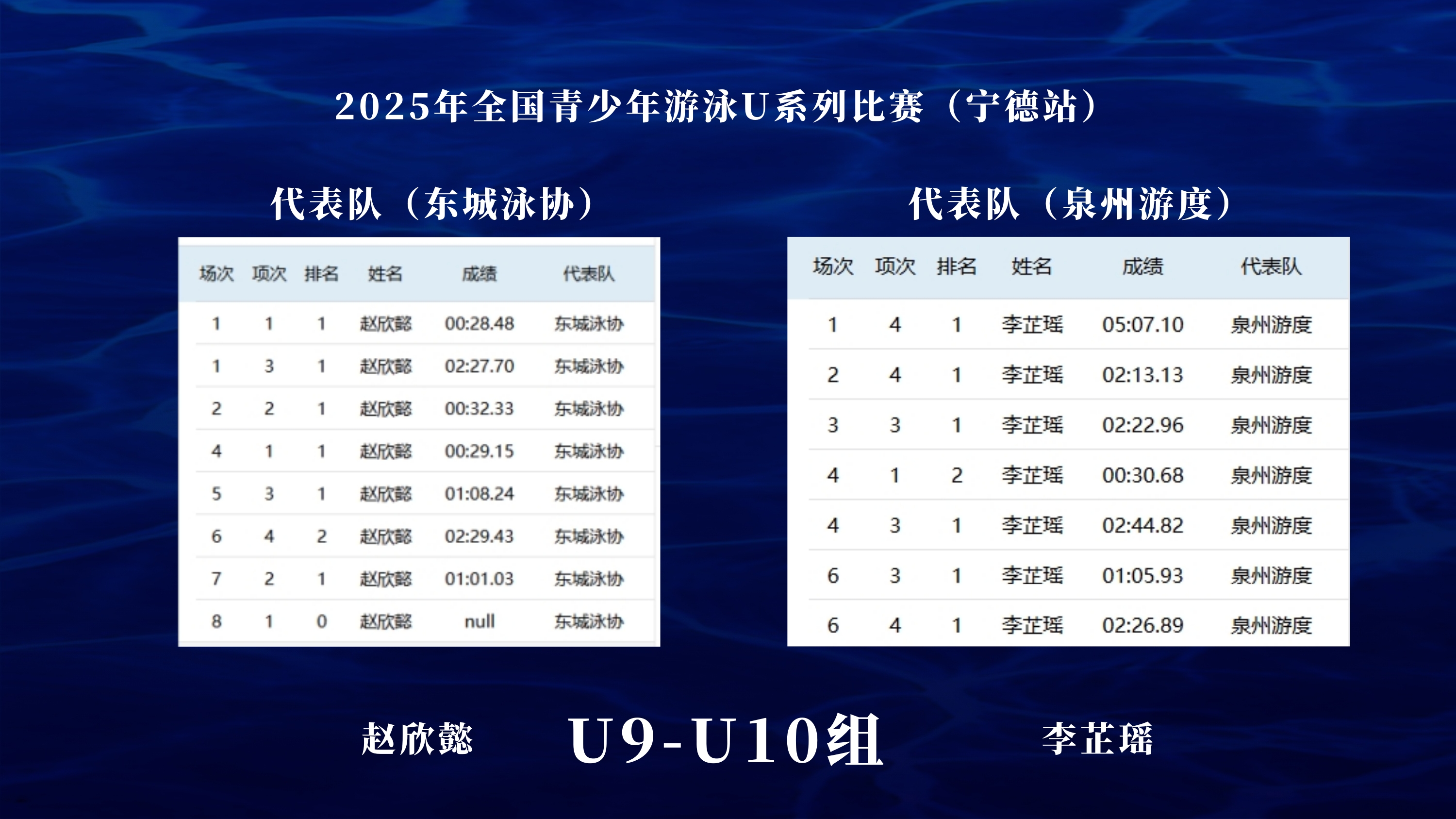 在本次U系列比赛的U9-U10组的比赛中,东城泳协(赵欣懿)和泉州游度(李芷瑶)的精彩表现,让现场的教练同行尤为关注。