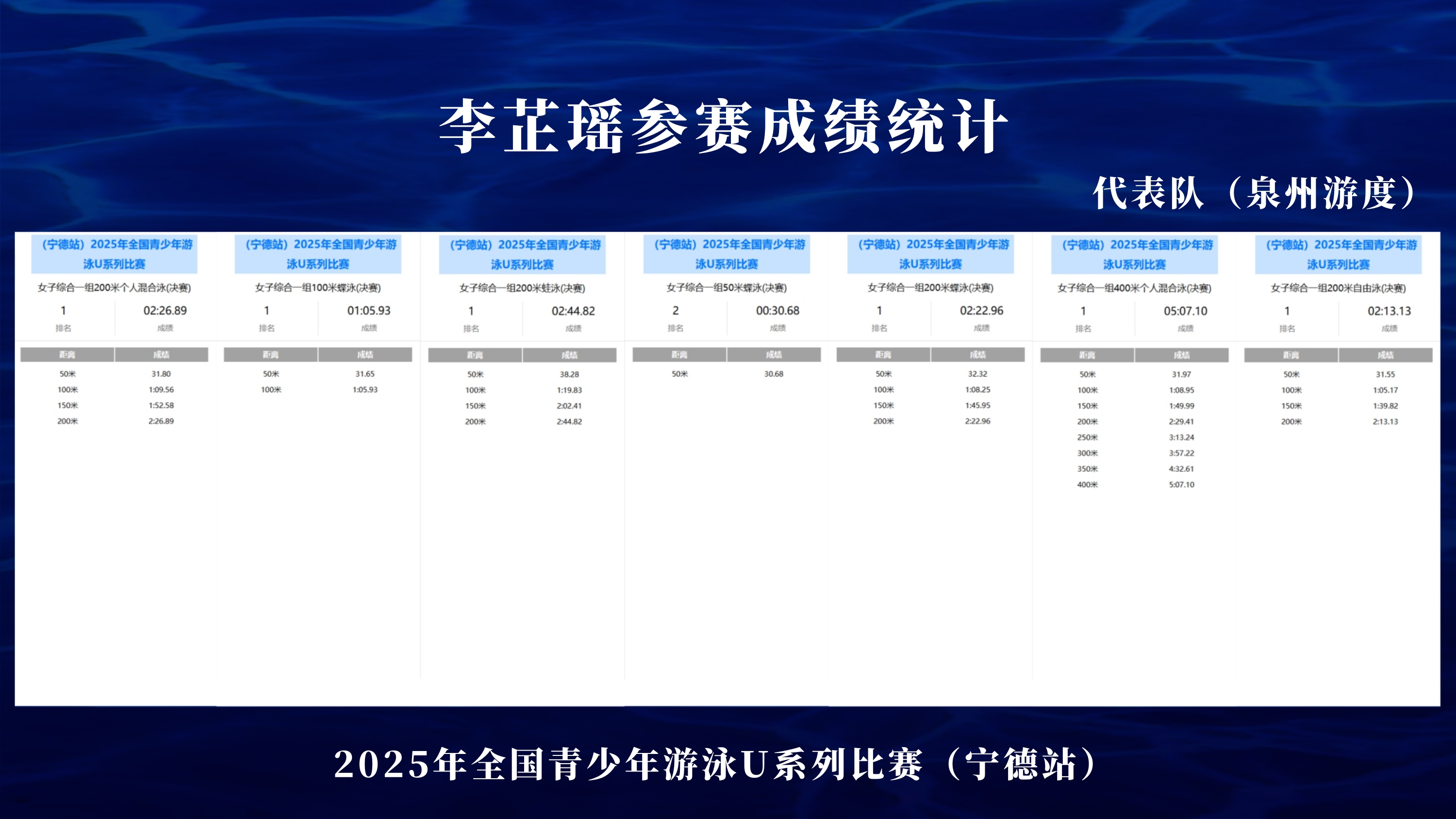同样优秀的李芷瑶,这位福建泉州学生选手,在混合泳比赛的表现令人惊喜。200米混合泳2:26.89,400米混合泳5:07.10,通过这两个项目的比赛成绩分析,她的有氧训练能力非常优秀,在整体游程中的分段配速状态,具有很大的发展潜质。