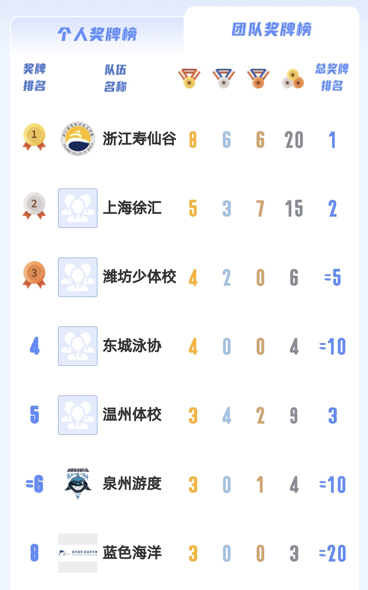 浙江寿仙谷代表队,以8金6银6铜,累计20枚奖牌数,暂列金牌榜、奖牌榜的第1位。