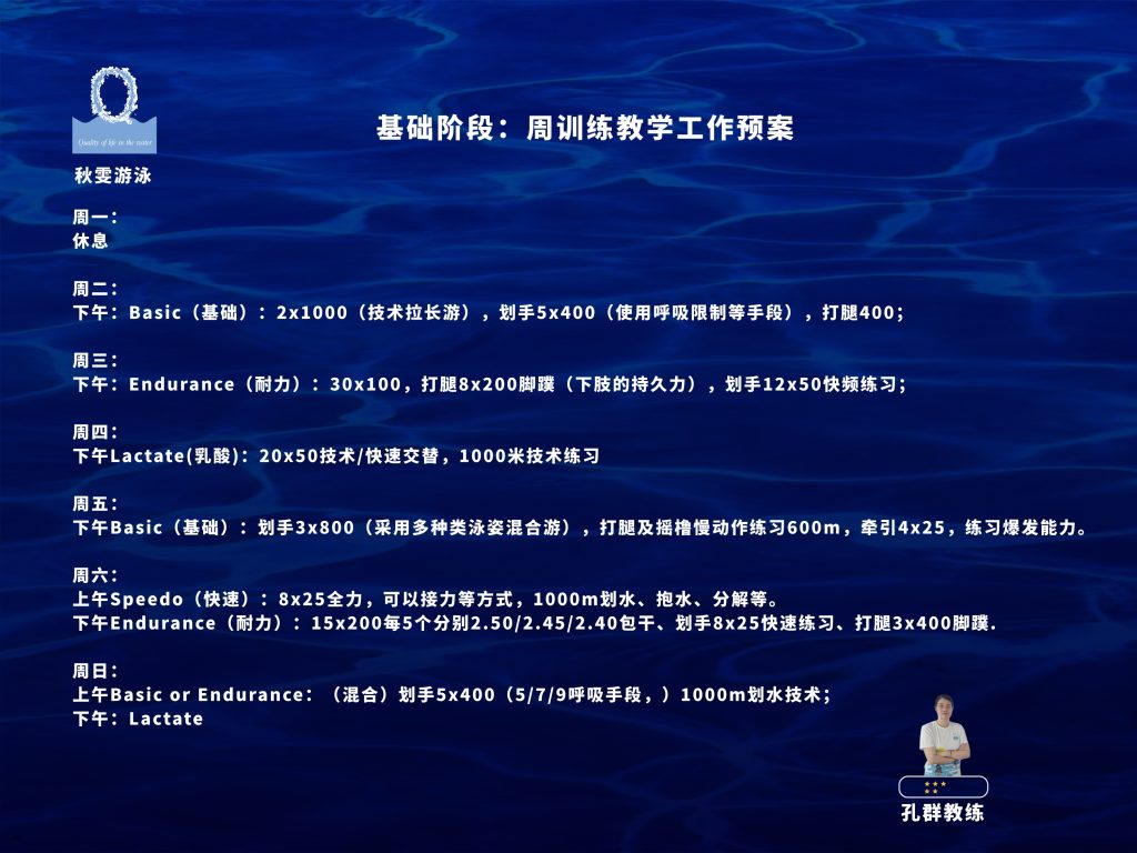 这是孔群教练在周末进行的长距离自由泳变速训练单元