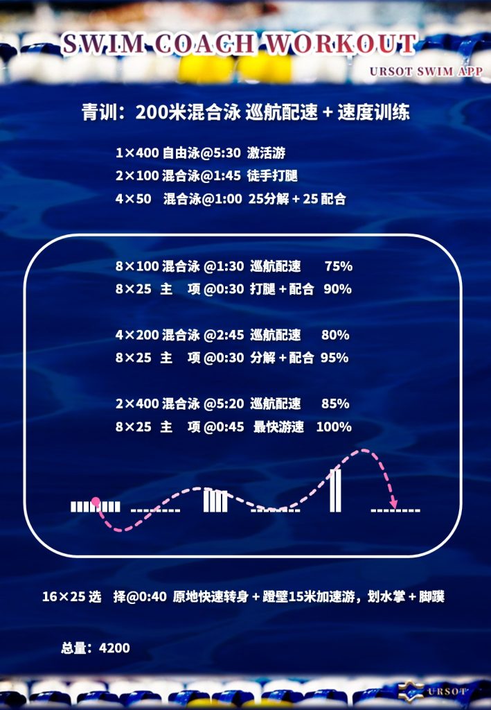 巡航配速训练单元,包括(8×100 混合泳 @1:30 巡航配速 75%)、(4×200 混合泳 @2:45 巡航配速 80%)、(2×400 混合泳 @5:20 巡航配速 85%),用于改善选手的有氧耐力和混氧能力水平。