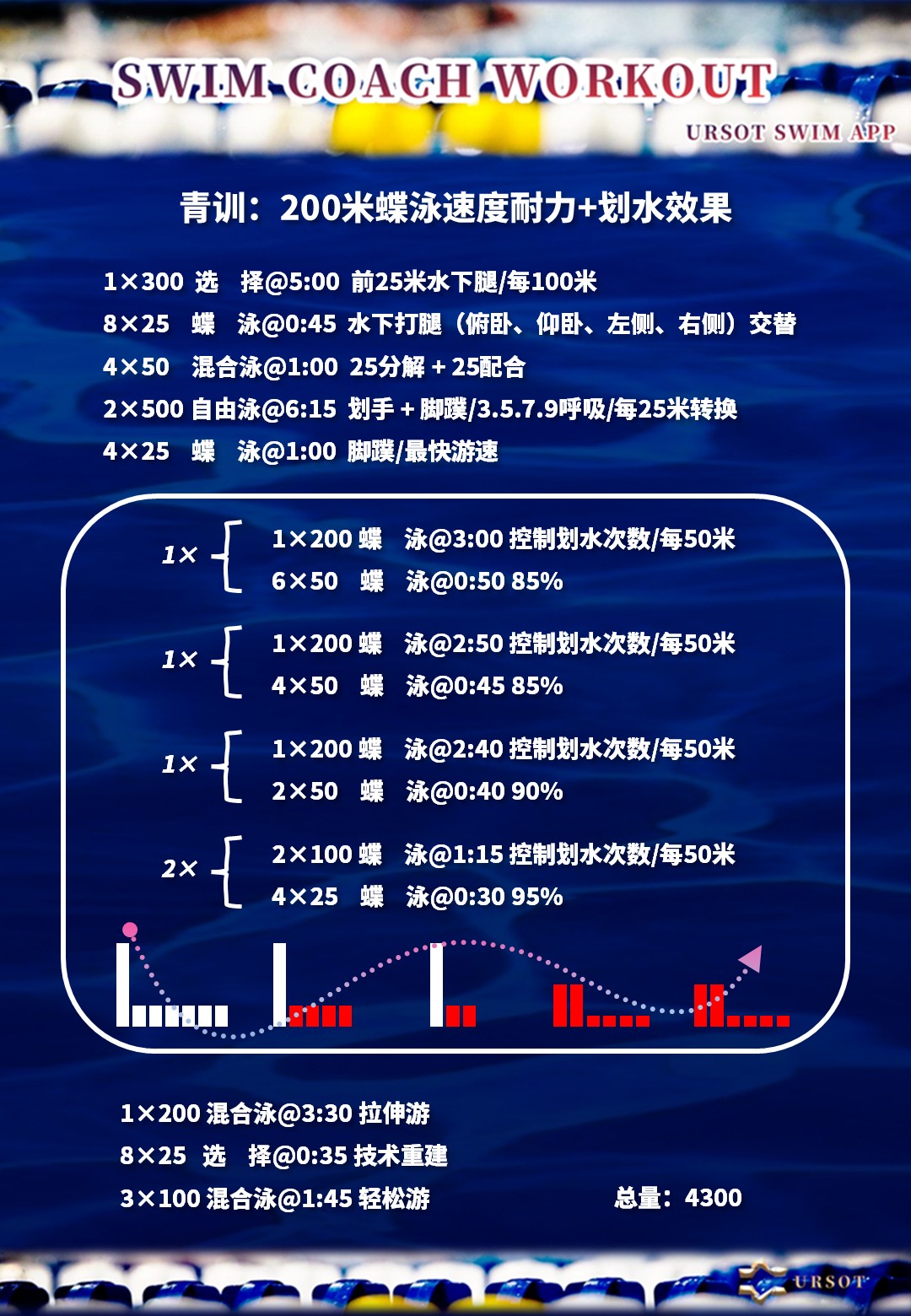 本计划适用于具备多年游泳训练基础的选手,应用于蝶泳和混合泳项目的专项阶梯强度训练,侧重划水效率与分段游速的控制能力,通过强化高效的肢体动作记忆,改善后程加速阶段的技术控制水平。
