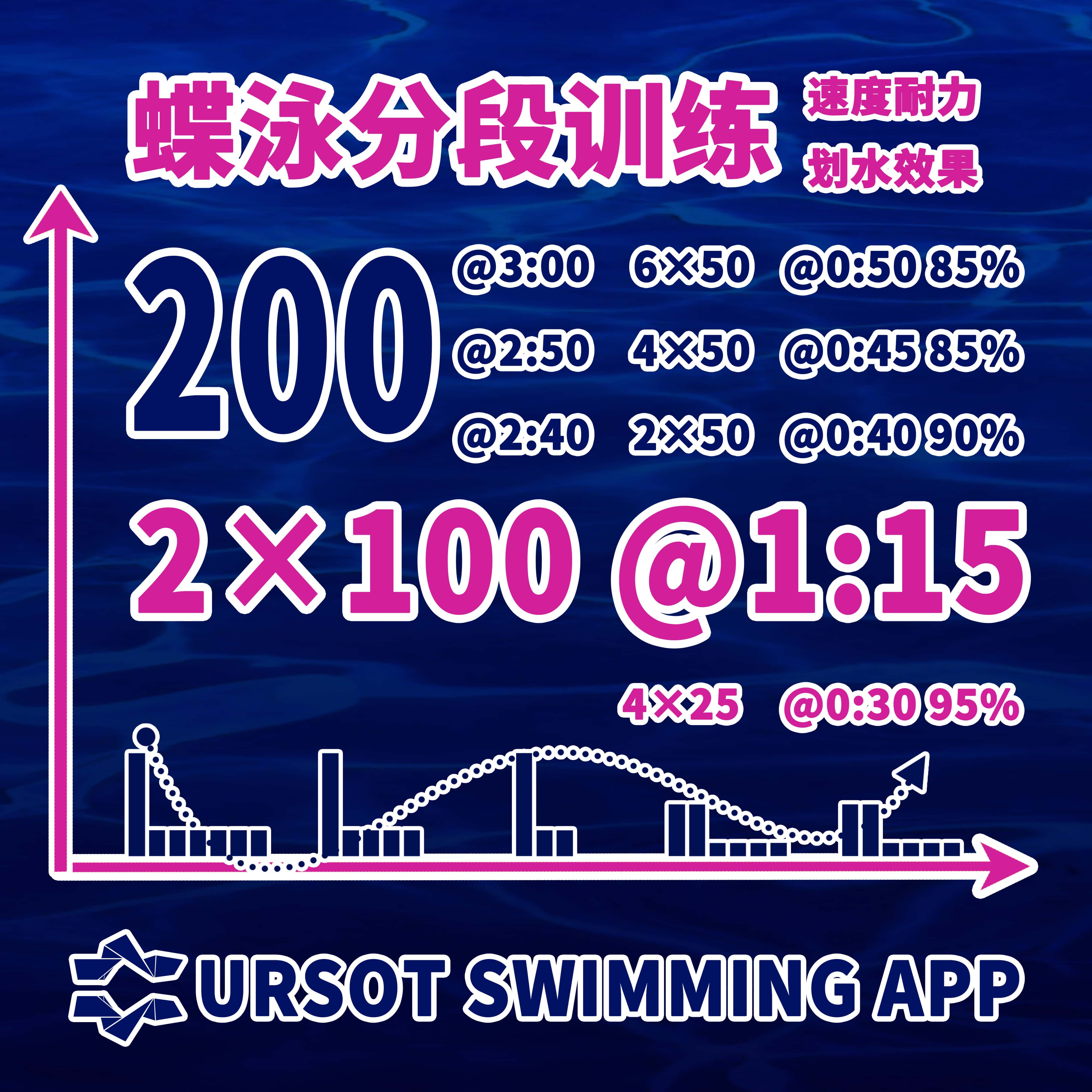 2、以2轮的100米蝶泳@1:15(控制划水次数/每50米分段距离) + 25米蝶泳(95%负荷强度),模拟高乳酸的比赛状态,激发选手在后程加速过程中的划水动力,强化在冲刺阶段中,技术动作与动力输出的持续稳定。