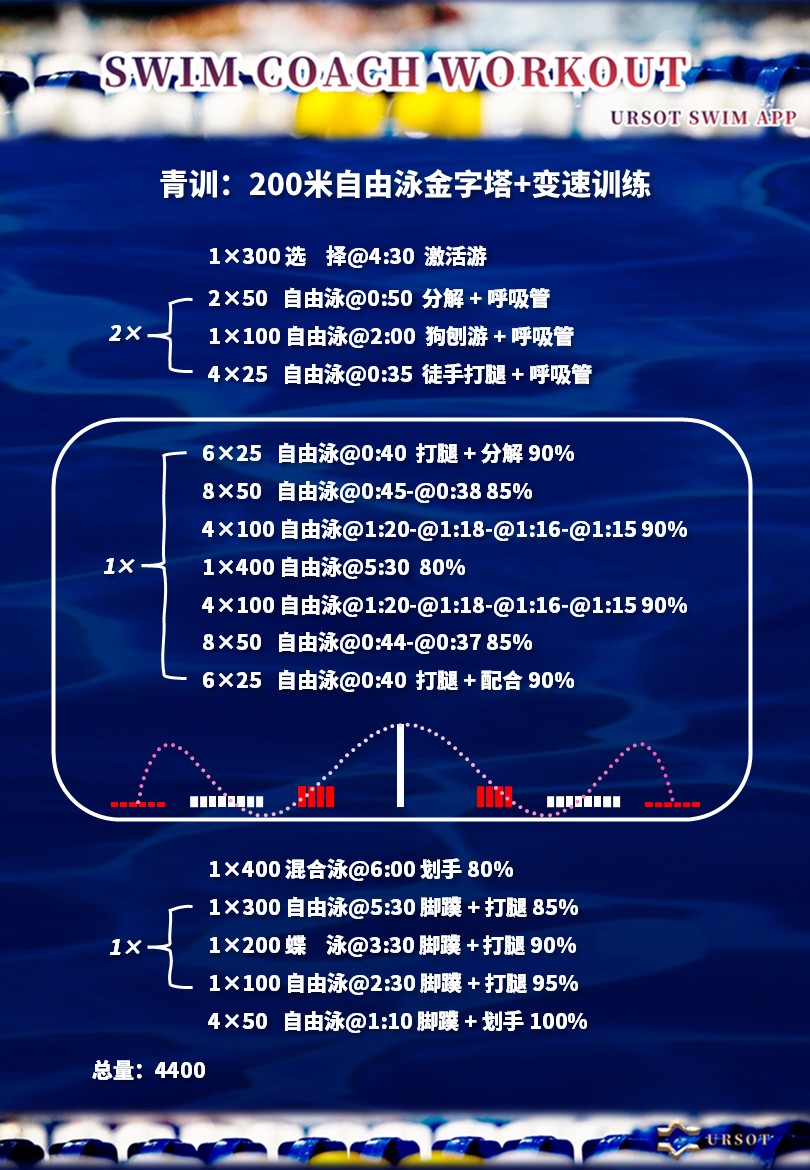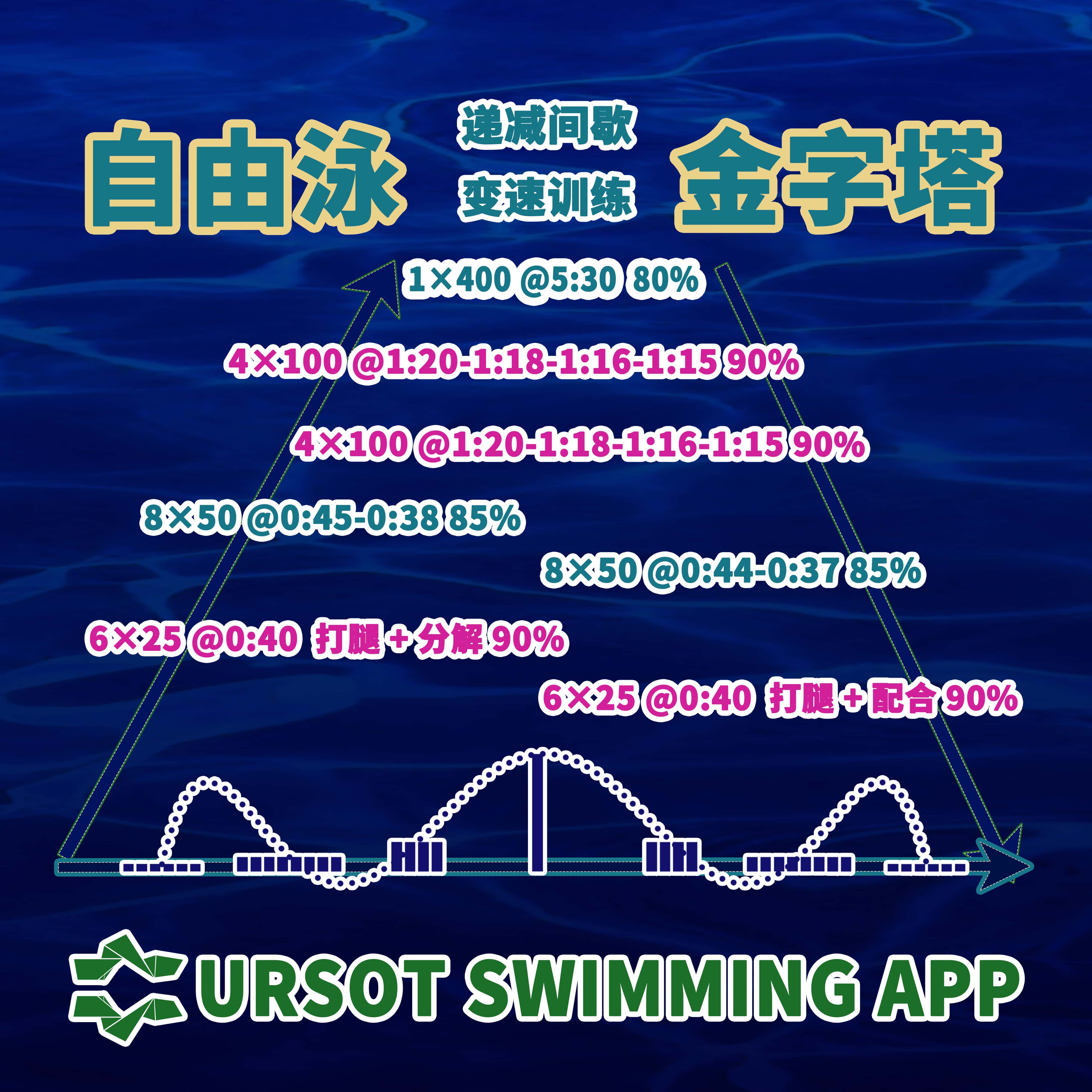 1、金字塔训练:6×25(90%) → 8×50(85%) → 4×100(90%) → 1×400(80%) → 4×100(90%) → 8×50(85%) → 6×25(90%)。在以距离为金字塔结构的组合训练单元,通过(快速-中速-快速-中速-快速-中速-快速)的波浪式负荷强度,对心肺系统与专项肌群进行重复刺激, 强化分段配速训练效果,激活后程加速能力。