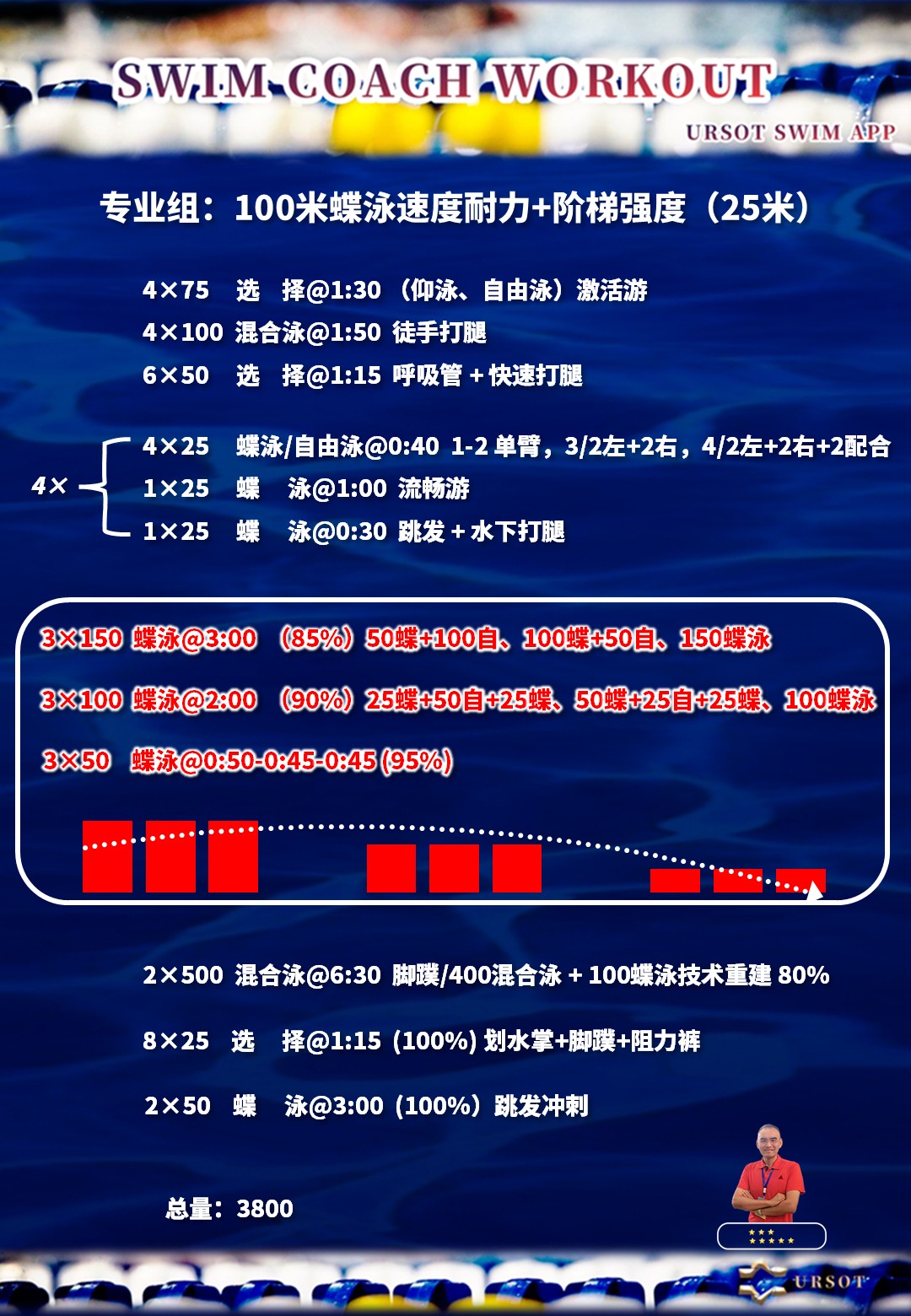 本计划适用于具有多年专业游泳训练基础的选手,应用于蝶泳、自由泳的短距离速度耐力训练,侧重动作转换与递增加速训练方式,用于强化后程加速与速度力量的整合能力。