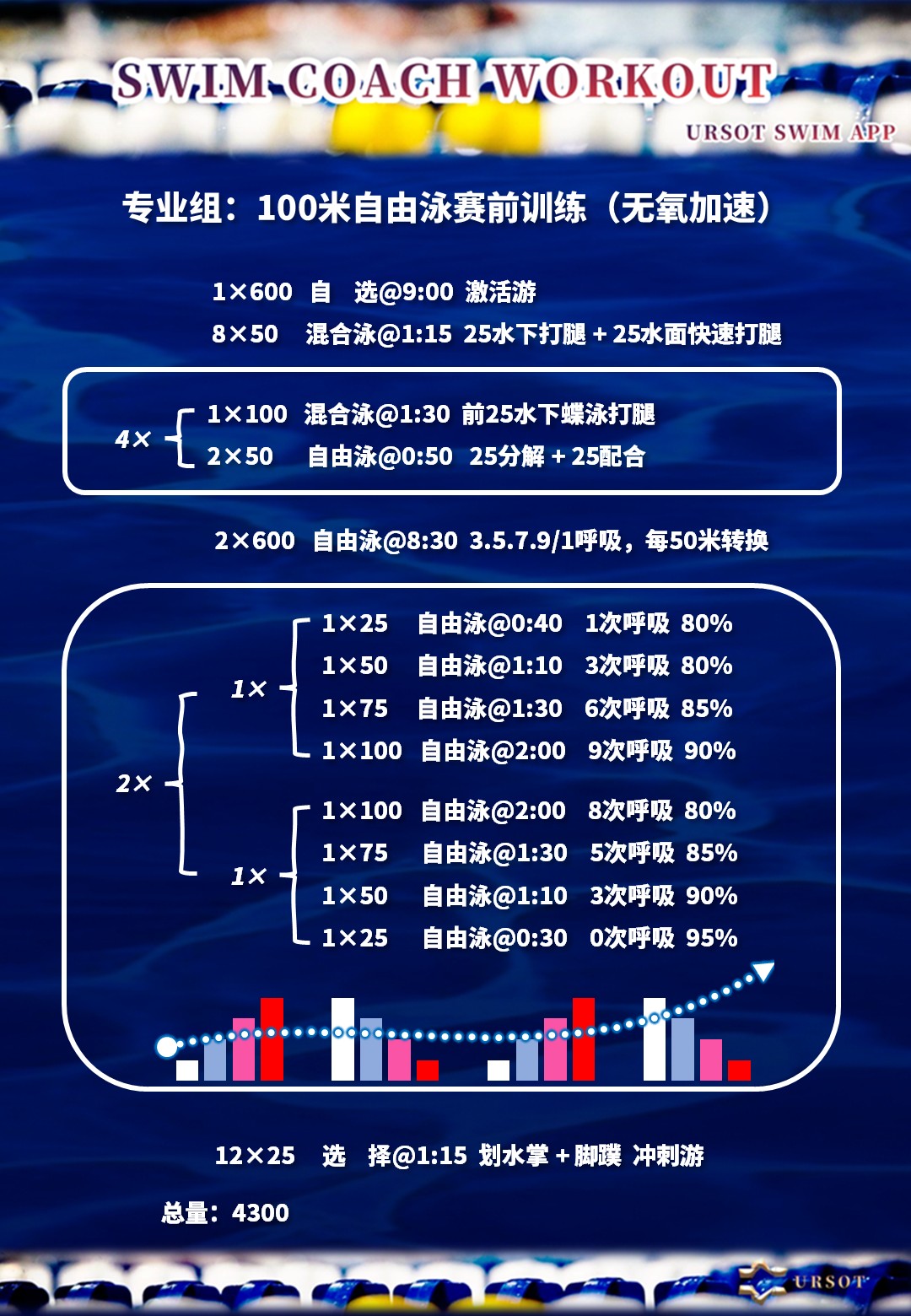 本计划适用于具备多年游泳训练基础的中短距离自由泳职业选手,适用于赛前高强度专项训练课,侧重强化选手在后程加速阶段时的呼吸节奏稳控能力。