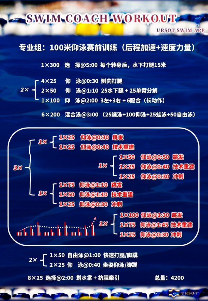 本计划适用于具有多年游泳训练基础的职业仰泳选手,用于加强仰泳技术稳控与后程加速能力,侧重高频划水过程中的动力输出,强化比赛技术与专项强度的匹配度。