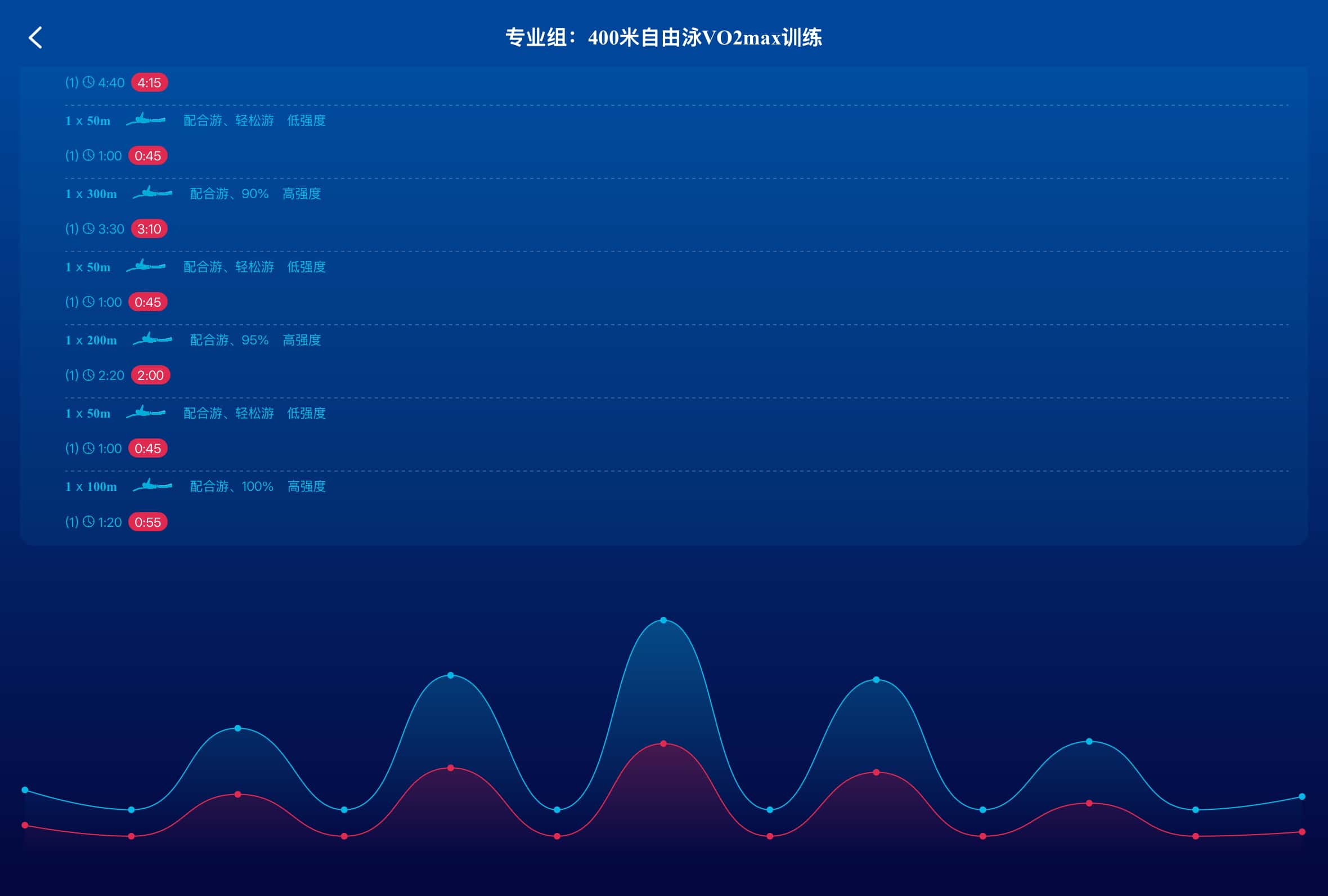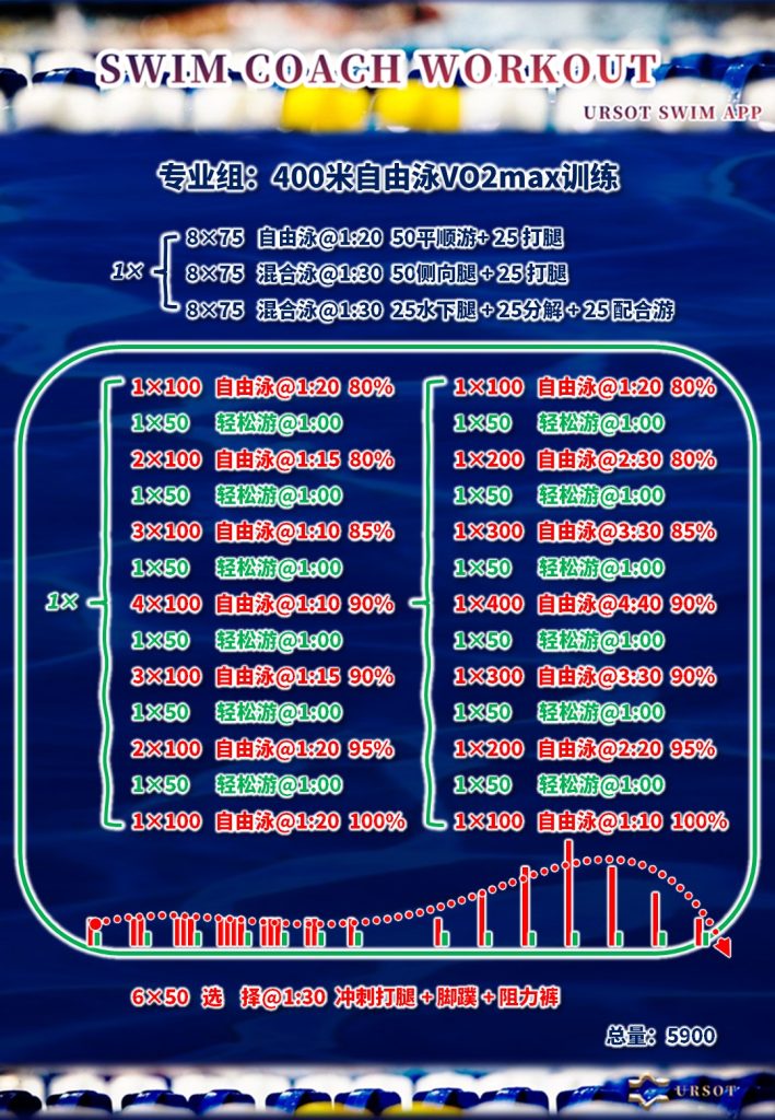 本计划适用于具备多年竞技游泳训练基础的职业选手,应用于中距离自由泳速度耐力训练课,通过2轮VO2max专项训练,用于改善高负荷强度的持续能力,提高后程加速水平。