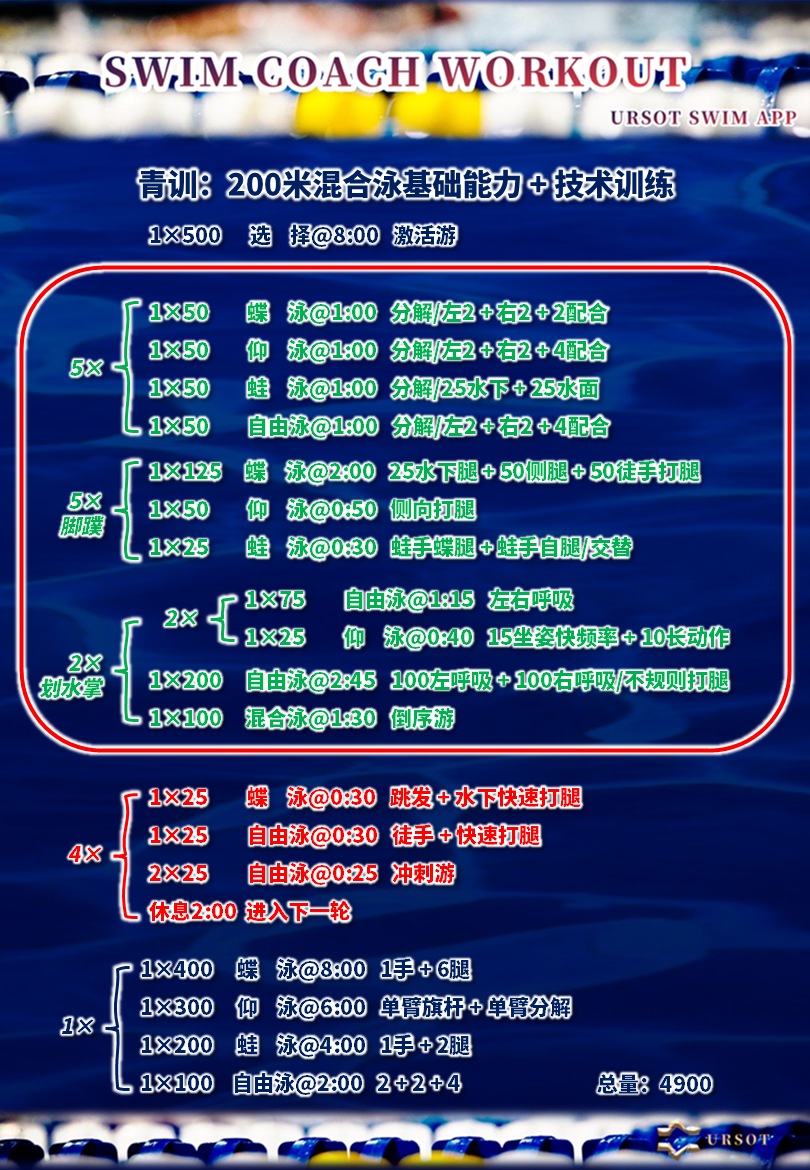 URSOT游泳运动训练系统,现已收录本套训练教案,欢迎游泳教练员、游泳爱好者、运动员参考调用,用于训练工作。