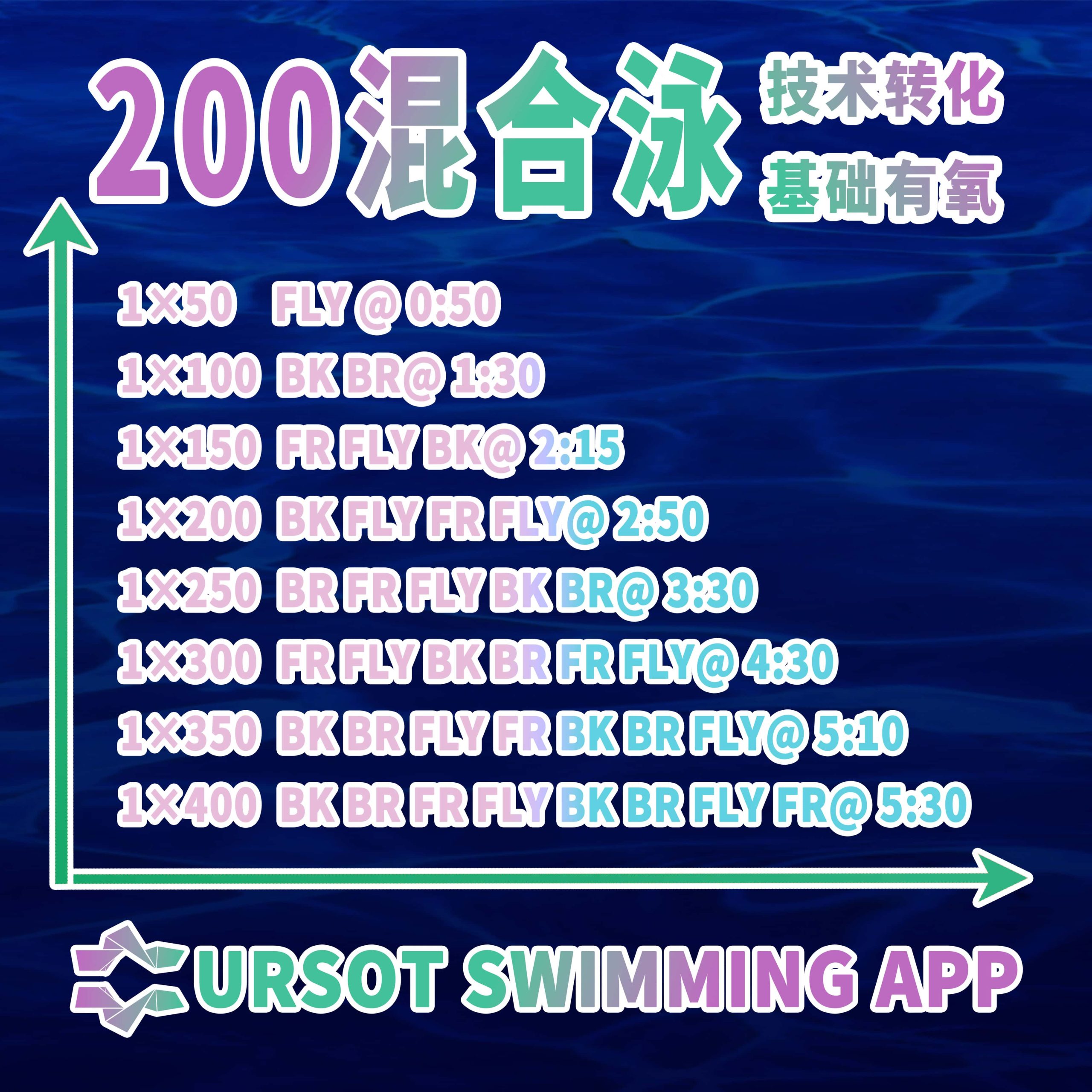 本计划适用于具备多年竞技游泳训练基础的青训选手,应用于混合泳混氧能力的训练,通过金字塔与阶梯强度训练,提供一个渐进式的强度爬升过程,结合多泳姿的快速切换练习,帮助选手加固技术动作的转换加速能力,已完善比赛技术的实用水平。